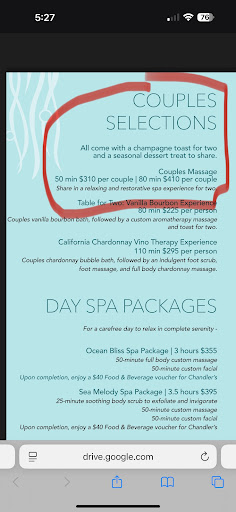 Read morePlease book an 80 minute deep tissue massage - you will not regret it! A friend and I stayed at the resort (for work) and decided to book a couple's massage (same massage room) for a birthday celebration. Talk about HEAVEN! Regardless of what type of massage you book, it is 100% custom tailored to you. The technician I was so lucky to get was PHENOMENAL and I couldn't be more impressed and thankful! I'm a fan of medium to firm on intensity and she delivered above and beyond! Overall, from the moment we walked in, the environment felt absolutely amazing! Every single staff we interacted with was so sweet, tea and lemon water is offered while waiting (I recommend the Jasmine tea - yum!), the entire process is very comforting and homey, and champagne is provided after your massage. There are also showers and a steamroom available. We sat outside on the patio sipping champagne after having all the stress melted away and it was the BEST kickoff to our day! Even if you aren't staying at the resort, you should check out the...