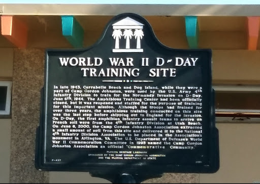 In late 1943, Carrabelle Beach and Dog Island, while they were a part of Camp Gordon Johnston, were used by the US Army 4th Infantry Division to train for the Normandy Invasion on D-Day, June 6th, 1944. The Amphibious Training Center had been officially closed, but it was reopened and staffed for the purpose of training for this important mission. Although the troops had trained for over three years, the amphibious training conducted on this site was the last step before shipping out to England for the invasion. On D-Day, the first amphibian infantry assault teams to arrive on French soil were from the 4th Infantry Division at Utah Beach. On June 6, 2000, the Camp Gordon Johnston Association extracted a small amount of soil from this site and delivered it to the National 4th Infantry Division Association to be placed in the Association's monument in Arlington, VA. The US Department of Defense's World War II Commemoration Committee in 1995 named the Camp Gordon Johnston Association an official...