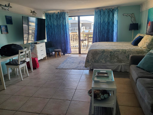 The condo quality varies because of individual ownership. Our favorite far and away is #315! We once ran into one of the owners - Carol and her tiny one-eyed dog - and complimented her place. She was very sweet and gave us a 10% off coupon. Evidently, they regularly come down from Georgia and use it as a second home of sorts -- which might explain the niceness and upkeep. The floors are tile and a beautiful laminate that looks like aged beach wood, and the place is beautifully decorated in jewel blues and whites. The downstairs is an open area with a kitchen and balcony. The upstairs loft is basically a separate bedroom. Plus, there are 2 large flat screen tv's (which, admittedly, are nice to have even when getting away).