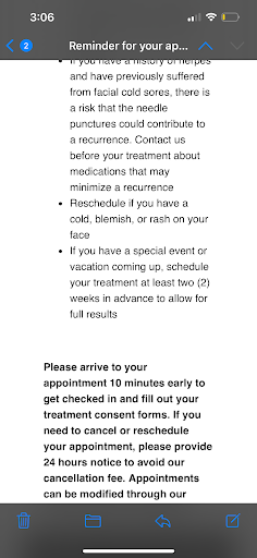 Read moreI went to Belle Vie based on the positive reviews considering I wanted to get microneedling done and my understanding that it isn’t safe to get that done just anywhere. I had gotten microneedling with Anteage ($700) at another place and I had been wanting to get microneedling with PRP, but the price at this other place was around $900. Luckily I found Belle Vie had Microneedling w PRP for $600! I made my appointment online and received notifications about my upcoming appointment. Personally I don’t like talking to people on the phone so it was nice being able to do this via text/e-mail.
