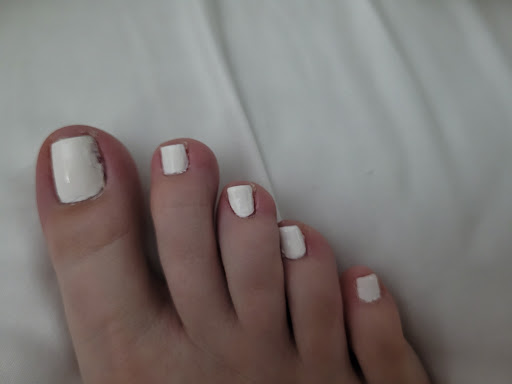 When it came time for him to paint my toenails, I told him I just wanted white nails. And boy, did he struggle to paint my nails. The paint itself was gooey, and I already thought it was an old bottle. When he left me alone for my toes to dry, I sat there . . . And sat there . . . And sat there. I could tell he had not done a clean job of painting them, but I was just crossing my fingers that they would dry.