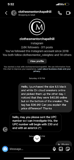 Purchased a pair of sneakers online for in store pick up. The shoes were originally $40.99 when I got home I noticed that the sticker on the bottom of the shoe had $36.99. I immediately reached out to the store via Instagram and an associate told me that sometimes things are priced higher online than in store and offered me a $5 coupon. This was absurd because most stores are cheaper online (because there’s no over head). Also begin a former employee I knew that wasn’t the pricing structure and I knew that the $5 coupon was off a future purchase. I declined because after this incident I do not plan on shopping there any longer. A few days later, the manager got involved and called it a “bit bizarre” that I said that I was cheated when they offered me a refund of $3. As you can see in the screen shots. No one ever offered me a refund of $3. Just the $5 coupon on a future purchase. The manager stated as you can see that after they price the item, they have no control over the price increasing. It’s funny how their software “magically” increases prices in their favor. I’m which I will be reporting to the FTC. After insulting my feelings, she then offered a full refund in which I declined because of her rude behavior and also because I live 1 hour and 15 minutes away. That place is full of liars. I will NEVER PATRONIZE THIS PLACE EVER AGAIN!! THEY HAVE BEEN IN THE WHOLE AND WILL CONTINUE...