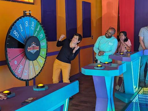 Our department recently booked the Epic Game Show Experience for a team outing after lunch nearby, and it was a blast! From the moment we stepped in, the colorful and over-the-top stage and setting truly captured the feeling of being on a real TV game show. The host's entertaining stage voice amplified the atmosphere perfectly.