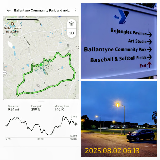 Read more2025.08.02 06:05 arrived at the parking beside closeby the trail access to Ballantyne District Park Trails. And out i went on an 6 mi CCW Loop of the neighborhood, and at end, ~0.6 mi of the Ballantyne District Park Trails The neighborhood was nice. During my ~2 hrs of walk, encountered a total of 10+ people and 4 dogs; everyone was cheery and...