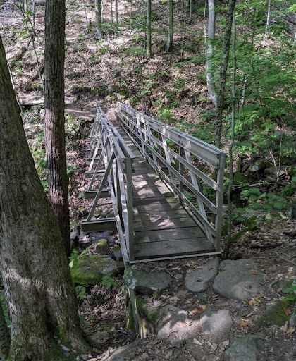 The first bridge you encounter on the proper trail is incredible. The trail makes a tee at an informative "you are here" sign. Before continuing right, check out the bridge to the left! Popular swimming spot but the way down to the river is VERY steep. After you cross the bridge, there is a secret blasted railroad cut you can easily bushwhack through. Neatly intersects the current railway. See image.