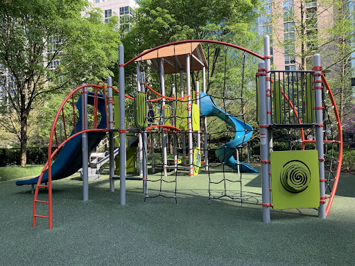 The Elizabeth Benton Playground in Lakeshore East Park is a gem of a playground. Set in the middle of the highly landscaped park, this playground features modern equipment, a small water feature, and lots of amenities. There are two main play structures. The larger structure includes a few slides and climbing elements as well as a few rope climbing features. The smaller structure, designed for younger children, features some low monkey bars, smaller slides, and smaller climbing elements. There is also a small interactive element and igloo-esque structure with holes for creative play. There is a standard set of swings (toddler and belt seat) and a standalone xylophone and drums. There is a simple water spray features (jets from the soft rubber surface) in the middle of the playground.