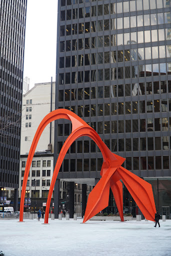 Located in Chicago's Federal Plaza in front of the Federal Building, this sculpture is a excellent example about Chicago's love of art, and the wonderful habit of displaying great art in public places, for all to enjoy. The Flamingo is the work of noted American artist Alexander Calder, and was commissioned by the General Services Administration. The stabile, as it was termed by Calder, bears the date of 1973, the year Calder presented the model for his sculpture in the Art Institute. The Flamingo was actually unveiled a year later, in 1974. At the same time another great piece of art by Calder, his mobile named The Universe, was unveiled in the lobby of the Sears Tower (Willis Tower). Unfortunately, The Universe was dismantled and put into storage in March of 2017. The Flamingo is 53 ft high, and weighs 50 tons. It is a steel structure painted in bright vermillion. This bright color makes an almost shocking contrast to the black International Style highrises surrounding it. It is open and invites the public not just to look, but to interact with it, to walk around and under it, to explore...