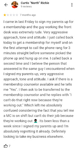 I went in that evening and told the young lady at the front desk that I wanted to speak with a manager. She went and got Kvon. He came out on the defensive. He said there was a misunderstanding; I said, "No, you knew perfectly well what you were doing. I asked you specifically in closed-ended questions about the pricing". This was when the truth came out. He was poking fun at my cancer diagnosis. He sarcastically said, "That is on you because I am healthy." I did not become upset because I knew he was very insecure and unintelligent. He went on and on and continued to argue with and antagonize me. I said, "I will not argue with you; I want to speak to a manager." He said, "You are looking at him." I continued with the young lady, canceled the membership, and walked out as he continued to spew insults.