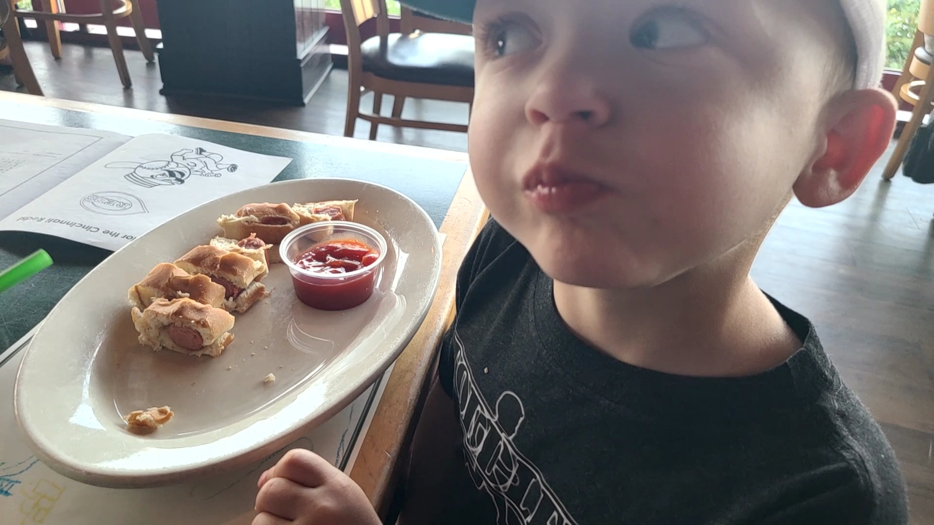 KID: Our son actually ordered for himself for the first time today at this place, telling our nice waiter Ron he wanted a hot dog. The cheapest thing on the menu and he already had one for lunch at 5 Guys, Three-year olds. lol He ate all of his hotdog and he didn't wait for the picture either. We did the cutting of the hotdog to make it easier for him to eat and keep as much ketchup off his face as possible. He also loved his fruit cocktail. Pieces were rather large for him so mom cut them up a bit. He picked through it as he normally does.