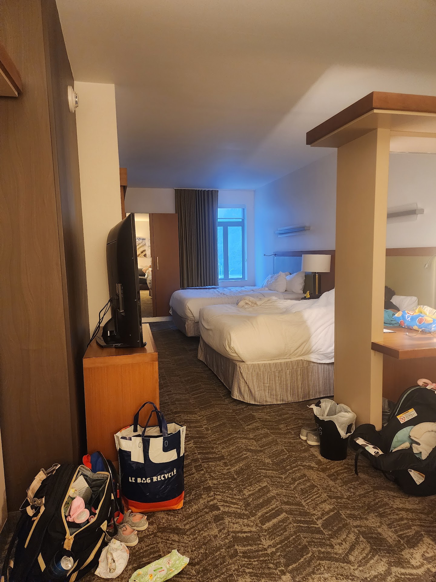 Check in was pleasant at the front desk staff. When we walked into the room the window curtain was off its hinges and did not fully close but the room seemed clean. The lighting in the room was very dark and the layout was also very odd. We went to dinner and arrived back at the hotel around 9:30. We noticed wet towels at the ice center area down a few rooms down the hall and boxes of food sitting outside the room next to us upon return. There was also a smell of something burnt like pizza but it was a burnt smell odor on the floor. Then we kept hearing the door open and close next to us for the next 15-30 minutes. I opened my door to see what was going on. When I opened the door the people across the way had their door opened with what looked to be a room full of children sitting on the couch in the room. I put the do not disturb sign on our door and mentioned to them how loud the noises were. We called down to the front desk and let the them know what was happening with the doors opening and closing and was told it would be addressed. Well the door opening and closes and other loud noises continued on until 1:30 am.