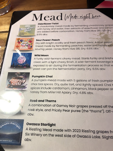 This is such a cute place! I found it while passing through the area and I'm so glad I stopped. I got to taste a couple and left with a 6 pack. Delicious session meads make a unique and delightful alternative to the area's popular craft beer and cider scene. While I do enjoy the occasional syrupy 13% mead, these are lighter, less sweet, and much more refreshing. I also like that they came in 12 oz cans instead of large glass bottles. Highly recommended for a unique beverage experience, I only wish this was closer. I would love to see these meads on tap locally (I live near Ithaca) or popping up...