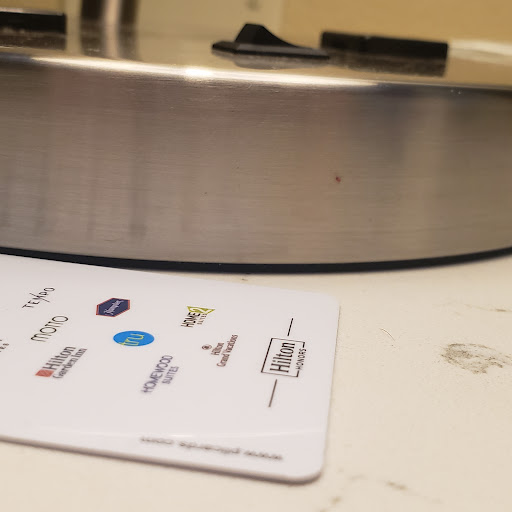 As far as the building...I cannot say the same. When I think Hilton I think quality. This was motel at best. Check-in was fine. I had to park all the way in the back, the room was all the way in the back, but the elevator is in the front. So alllll the way down, up, and allll the way back. The 3rd and 4 floors had twin mattresses sitting against the wall by the elevator. Did someone get sick? were they there if you had to sleep in the hallway? Not sure. The hallway lighting looks like it got hit by the luggage cart about 25 times. No AC in the hall, so the stale marijuana was potent. The room was mediocre at best. AC panel was hanging forward off the wall, took it a long time to cool, the carpet is black from stain. The bathroom was the icing on the cake, though. The toilet seat is on crooked, and the tub looks like it's seen its share of guests. Rust, stained black, and the caulk long-since gone with mold. I am a guy, so I don't really need much in the way of the bathroom, but the lighting was so dim I could barely see my toothpaste on the brush.