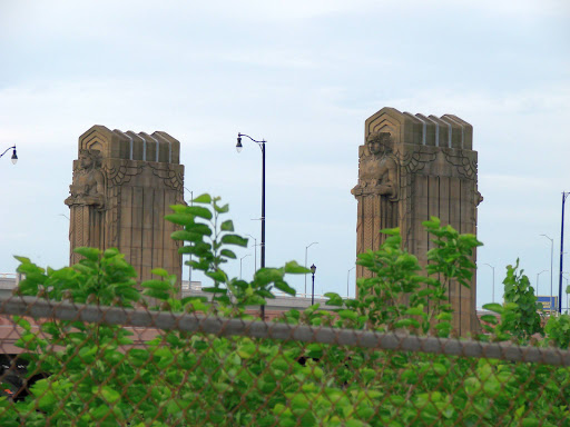 I love bridges (bias disclaimer). The Hope Memorial Bridge and Viaducts span the Cuyahoga River Valley with a half mile viaduct on the East side of the river (from Ontario Road) and a third of a mile viaduct on the West side of the River (from W. 20th Street). The bridge has iconic abutments. The four prominent supports sport the carved stone images of the Guardians of Traffic by sculptor, Henry Hering Frank Walker (architect). The bridge has broad walkways on both sides of the bridge that afford wonderful views of the river valley. There is a garden at the east end of the viaduct (North West corner of Ontario & Carnegie Avenues). The garden hosts a trio of elephants promoting the Cleveland Metroparks Zoo. I am adding some pictures taken from W. 3rd Street...