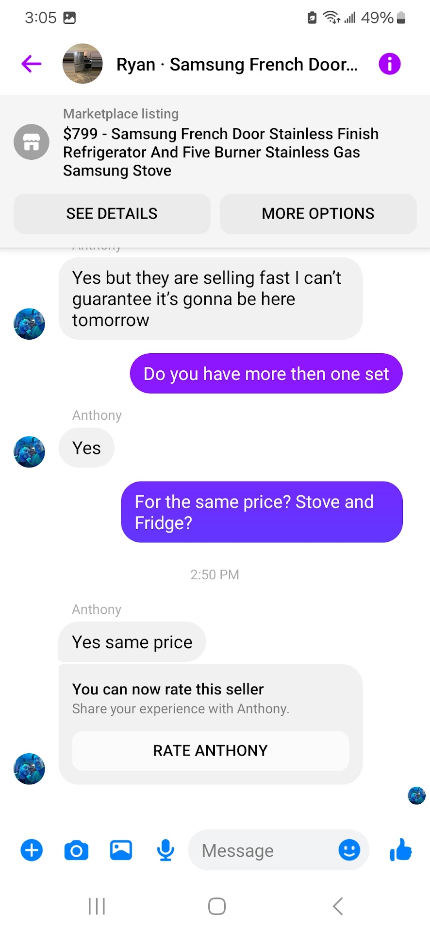 Read moreIf I could give one star. I would. There was a new fridge and 5 burner used stove on marketplace for $799.for the set. I message and asked if it was available. They said yes, I went there and all of a sudden. It was sold which didn't make any sense and tried to show me dirty nasty refrigerators that were way more expensive. So as I'm looking on marketplace the next day the exact same refrigerator and stove for 799 was on marketplace. So I message then again, and asked is this available. They said Yes, it is available. Then I had my friend message.on a different ad with the same stove and refrigerator Is this available? Yes, it is available. I called the store and asked to speak to the owner. I was told the owner is unavailable. So I asked to speak to the manager about this all of a sudden. He hands the phone to the owner, which was not available. And by this time I'm very upset because what they are doing is so wrong. He was very rude to me Called me karen hung up me. I have contacted the news. And I will include screenshots of our conversations. Everytime i asked a straight up question they read it and ignored it. beware of this company. They put these things on the internet to get you in there to tell you that it's no longer available.Then try and sell you something else that's either super damaged or disgusting for a outrageous price. Shame on you Anthony for taking advantage of people just trying to get through life and who work very hard to get what they can get. You are vile. And if that is me being a Karwn well then be it. You are...