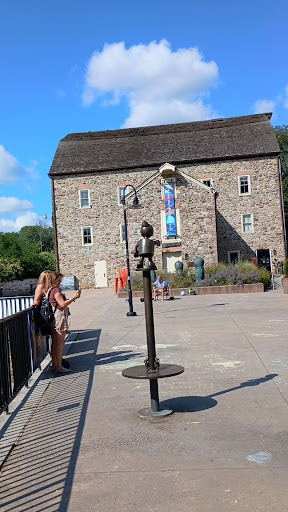 The town around it is super charming. There is a bridge that has a pedestrian walkway that leads to the Red Mill Museum Village. There you will find a few benches that are shaded and others that are not. It’s a beautiful place to sit and relax before or after the museum and you can see the Hunterdon Art Museum while you are seated there. Directly outside of the Hunterdon Art Museum you will find a few art installations, including works by Toshiko Takaezu and Tom Otterness. You will also find a few steps down to the water.