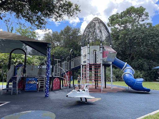Read moreFun playground! Creative and different with the rocket ship theme. Kids loved it. Has the interactive Biba app. Volleyball courts, tennis courts and basketball courts as well. When we came the nature trail was closed :( They have benches, covered picnic tables for lunch, cement corn hole toss (bring your own bean bags), bathrooms, water fountains and water bottle filler. Bunch of trees for some shade so it’s not so bad in the afternoon sun. Decent size parking lot that is close to all the fun for easy runs back to the car if needed while...