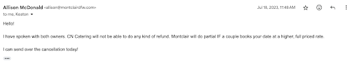 Read moreBride beware!!! Hard to articulate the disappointment in my experience with Montclair. This venue only cares about making money and doesn’t actually care about you having the wedding of your dreams unless it means they can line their own pockets. We were so excited about having our wedding here, but moved out of state and canceled over 200 days out. Unfortunately, the owner was unwilling to speak with us regarding a partial reimbursement for our nearly $5000 deposit (all paid within 60 days of signing) and proposed a contingency agreement that was designed in their favor, photo below. Our wedding was supposed to be 2/24/24 and I haven’t heard anything from Allison or Montclair since 10/14/23. The way they work with their exclusive caterer, CN catering, also blurs lines because Allison is an employee of both and they can pick and choose the scope that falls under each company to their own benefit. If you’re set on this venue, negotiate the cancellation language to hold onto as much of your $ as possible for as long as possible. Otherwise, take your hard earned money and have your wedding ANYWHERE ELSE. The way they run their business is shady and they don’t...