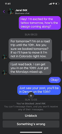 I was gifted a $500 for an 8 hour tattoo gift certificate that Jerel was selling through Facebook, so it wasnāt even purchased by me. Elements of my tattoo that were discussed included 4 photos and some custom creative freedom that I wanted Jerel to have ( I had hear about and seen his free handed work and wanted some of that). Jerel was HIGHLY recommended to me by multiple people. The main points in the included photos are 1. He mishandled my appointment (was June 3rd) by planning an out-of-state trip for the same time. 2. Wanted to rush 8 hours of work before going to Denver the same day for a convention that he booked himself for. 3. Instead of fixing his mistakes professionally heād rather give the money back and not work with you. 4. HE WILL VAGUEPOST ABOUT HIS CLIENTS ON FACEBOOK. Jerel is running a ābusinessā but quite literally just does what he wants to do, despite people genuinely wanting to support him. Not to mention my boyfriend has a half done tattoo from Jerel on his leg thatās been paid for and he has made no attempt to contact my boyfriend to finish it. Jerel does not respect your time or money and therefore is not a respectable tattoo artist. Go...