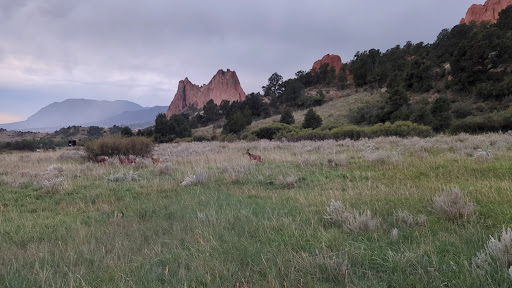 Great hike to see many of the Garden of the God rock foundations and avoid the big crowds. Most people park at the main gate and do the easier paved walks. We went on a Thursday mid June. We parked at the Trade Post arriving around 8:15am before the main visitors center opens at 9. There was plenty of parking at this time. We walked to The Siamese Twins rock foundations close by. From there you can get onto the Palmer Trail and take it to the north most area at Main parking Lot 2. I would consider the trail fairly easy. It is hard packed but is not stroller friendly. Once you get there, there is a restroom and the paved area. To get back we could have recalled the full Palmer Trail but we took part of the Scotsman back to Palmer...