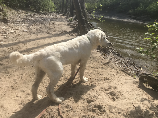 I also raise service dogs for a nonprofit, and the creek below the cliffs is a great place to take them for enrichment and introducing them to water. I've taken our pups there several times now, tied a long line to the tree roots and let them play, it's a great activity, especially since we now have a golden retriever who is terrified of water that we're teaching that swimming is fun with...