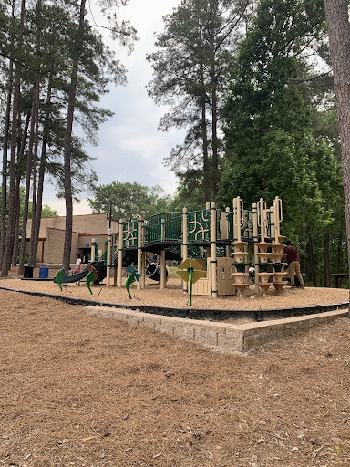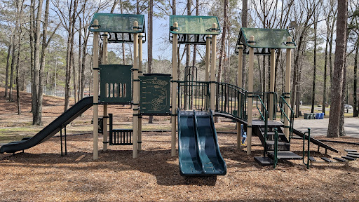There's two playgrounds, and older kids and a little kids, a splash pool area, some walking trails, and it looks like some kind of community center. Lots of trash cans, no outdoor bathrooms though there are probably some in the...