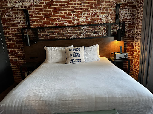 Read moreWe were blown away by the service and beauty at this new boutique hotel! The attention to detail in the interiors was fantastic-incorporating reclaimed wood and elements of the old mill into a fresh design with modern, yet cozy, colors. The exposed brick in our room was particularly charming. Our room was outfitted with a large TV, a google nest hub, a refrigerator, and a nespresso. There was also a cappuccino and coffee machine downstairs in the breakfast area to suit coffee needs. We didn’t eat breakfast at the hotel, but we’re pleasantly surprised by a complimentary continental spread. The bathroom was wonderfully appointed with high end fixtures and a dual rain and handheld shower heads. We brought our dog for our stay and the hotel left a darling goody bag in the room for him upon arrival as well as a custom pottery dog bowl for use during our stay. The hotel staff even made a point of remembering my dog’s name and greeting him when we walked through the lobby, which was so charming. There is a large grassy right outside the hotel with a doggy bag station for walking. The hotel is also right on the river walk, which connects it to the downtown district. The river walk was a highlight of our stay-perfect for walking a dog. It is well-paved and has a beautiful view of the river while you walk to town. Certainly our preferred means of transit during our stay. Overall, I would (and have to family and friends) highly recommend a stay at City Mills. Charming and fresh accommodations, a convenient and quiet location-right on the river, and unbeatable service made for a...