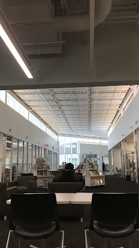 This is a very open library, with various areas that serve kids, teens, and adults. There is a computer lab and a quiet study space, and a space designated for homework help. There is a lot of seating for students who are looking to study. Lots of windows, which makes it a wonderful library.