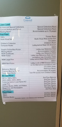 I have always loved this library. It’s very professional and cheerful. Lots of places to study quietly. I have one comment, not a big one, but still. The communal area for drinking coffee has nothing that designates it as Concord. No pictures, no nothing. Plus, a library should be about reading. Little nooks, etc. I know Concord is aware of this because there are so many places in the library. The coffee area is large open, sterile, totally non-private. Could you import a few large plants or something. Even fake I’ve would be fine. Maybe some sort of adult play structure, a fake gazebo? Anyway, a very nice library.