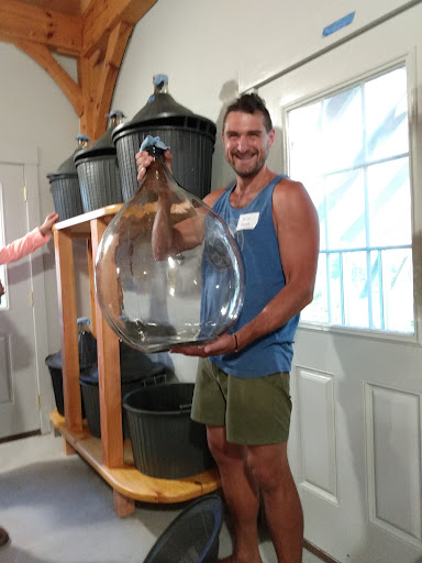 This summer, attending a Northeast Organic Farming Association of New Hampshire CRAFT of Farming event hosted by SHARA Vineyards, I was amazed that organic growing of grapes in not only possible, it is done right here in NH. I came to learn, to have my views changed regarding organic grapes, and that was a success, I will be adopting some of these practices. Pictures: Nico showing off a demijohn, whose shape makes sense for organic wine-making (he'll explain). Makes me think of a similar shape in ancient Greek amphora. Vines covered to avoid birds - do it early, so birds never get the idea that good stuff is there. Itasca grapes, a new thing here, they mostly do Marquette, a multi-hybrid red. Both grape variants are naturally resistant to many pests. Daisy fleabane, a natural antifungal(?), a tea is...