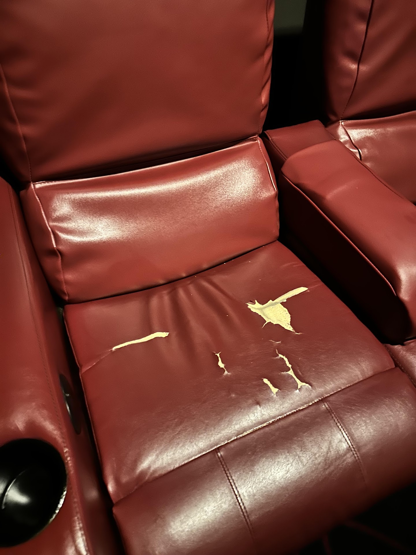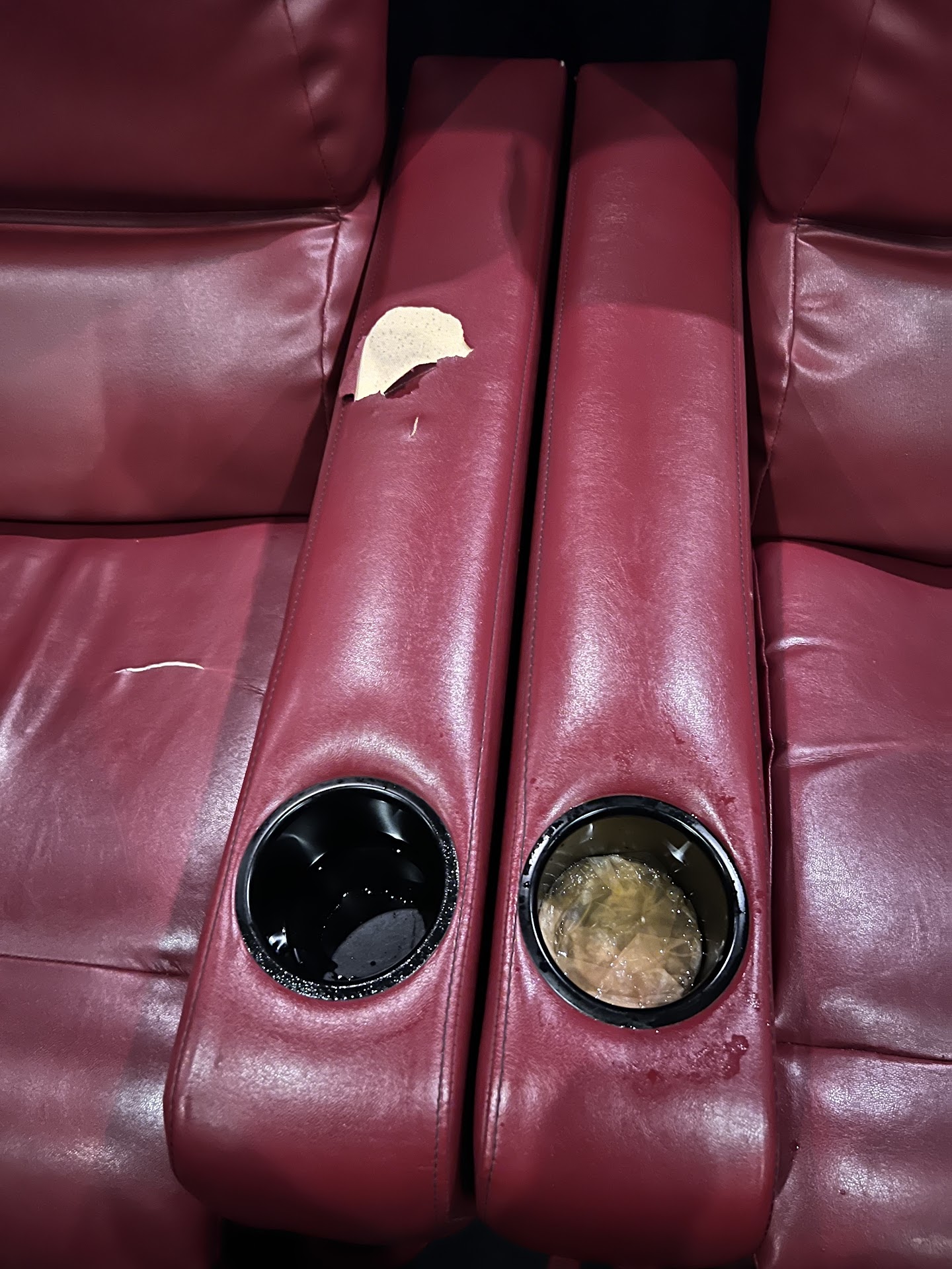 Read moreWent to see Thor last Saturday night about 9pm. The refreshment counter was nothing short of disgusting: popcorn, spilled beverages all over, including in front of the cash registers that had people working at them. All of the garbage cans were overflowing. The butter/condiment area was even worse. Mentioned it to a manager, who apologized and started cleaning. We went into our theater about 20 minutes before showtime, and the theater was dirtier than the refreshment counter. Ripped "leather," about an inch of disgusting liquid in the cup holder (see photo). OK... guess they hadn't gotten around to cleaning it yet. At 10 minutes before showtime, seeing nobody going in to the theater to clean, I called over the same manager as earlier, who radioed for someone to come clean. Seats in our row were broken (not ours, and we didn't check other rows), they are in terrible disrepair, and they clearly don't have enough staff to keep the place tidy (much less "sanitized," as advertised).