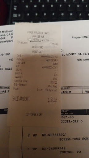 Ā Ā Ā Read moreI need a replacment part for a dryer, I found Coast appliance and it was a half hour drive. I used their website, found my part - which said was in stock but I wanted to call and ensure. I called and they we're helpful to confirm the part was in stock but after asking which location they gave me a 10 minute hold ...they can back saying oh yes.. no need for name ok. 1 hour 10 minutes later i waited on line only to find out they don't have it. Seems like a pretty simple procedure but they sure wasted my time and went on line and having it shipped next day for 3 bucks less with next day shipping. sorry I try to always buy local but when local shops waste your time via 3 different...