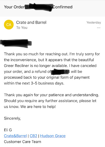 My family initially intended to use Crate & Barrel to furnish a new home. We have intentionally avoided Crate & Barrel while this fiasco drags on and will continue to do so until it reaches a satisfactory resolution.