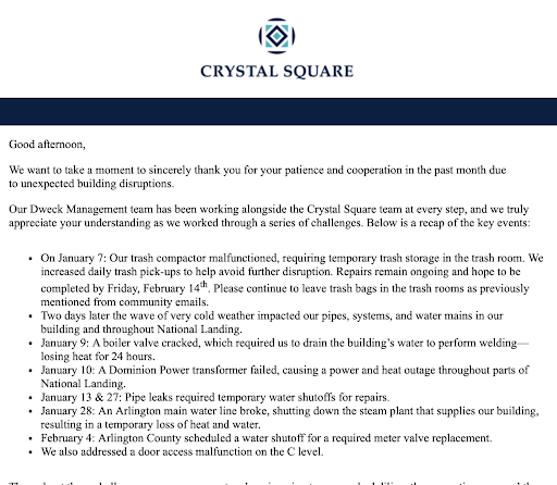 For starters let me say that Darlene in the leasing office is amazing. My wife flew out to Arlington for a Conference and Darlene worked around my wife's schedule to provide her a walk through of Crystal Square amenities and the apartment. Darlene, the property manager (Anne) and the maintenance team have all been great. We had an internet issues upon moving in and Anne worked it out quickly, a couple maintenance issues that were handled the same day by the maintenance team. Overall, a great experience with the Crystal Square team! About the apartment, my Family lives in a renovated three bedroom apartment. The appliances are all stainless steel and match, the floors (outside the bedrooms) are all laminate hardwoods and the bedrooms have carpet. Bathrooms are a little small but, there is great closet space and a nice open floor plan feeling. People complain about the AC / Heat being too loud from the wall vents...I have to agree but, then again I have to say that the AC and Heat both work great and it is wonderful to walk into a nice cool apartment after being in 90 degree heat in the summer. Construction is also a complaint in many reviews, it is going on but it really isn't a big issue...some days are louder than others if you are home teleworking. However, it isn't something that is going to end your day and make things miserable. The gym is nice, a few treadmills, ellipticals, stair climber and rower. There is a Smith Rack, a cable crossover, a decent set of dumbbells and kettlebells. The outside patio is nice with a firepit and three gas grills. I haven't had a chance to use the pool due to COVID but, it is big and looks like it will be a lot of fun once it opens. There is a rooftop area too, haven't been there since it is under construction but, I heard it will have a grill and some seating areas and the views are amazing. The parking garage is decent, cost $100 for one car and another $175 for our second. The door is key FOB to get into the building and you have four elevators to take. My family is not a pet family, this complex has A LOT of dogs...they aren't loud and are really irrelevant to us but, you can smell them occasionally in the elevators. There is a small dog park if that is something you would use. The location is amazing! The complex is a .2 mile walk to the Boeing Fields (turf fields for use with playgrounds and running areas) and it is right across from the Crystal City Waterpark (a large fountain that has beer gardens and other events on the weekends) and the building is also directly across from the Mt Vernon trail that offers 18 miles of paved trails to run, walk and bike all over the place...3 miles to the National Mall and 4 miles to Old Town Alexandria by trail. There are parks along the trail and tons of people out exercising and enjoying being outside. We are about 1 mile from Reagan International Airport, I have not heard a plane from my apartment in the 6 weeks I've lived here...the airport noise is not an issue. Plenty of restaurants to walk to within 1/2 mile or less, beer hall, wine shop and Costco (7 minute walk). Bought bikes when we arrived and with the exception of travelling to work you can really do everything you need around here by walking or riding you bike. There is an underground shopping mall called Crystal City Shops...haven't really explored it that much due to COVID but, there are some nice shops and places to eat and leads directly to the metro so you don't have to go outside at all. The building is adjacent to the city bus line and you can catch any bus you need and the Pentagon Shuttle picks you up across the street at the Crystal City Waterpark. I would recommend Crystal Square to anybody looking to move into the Crystal City area. If you happen to work at the Pentagon it takes four minutes to drive there! My family is happy here and we are glad we made the move here. The school district for elementary is Hoffman-Boston and takes about 12 minutes to drive there, 2 miles away and it is on the way to I-395 in the event you...