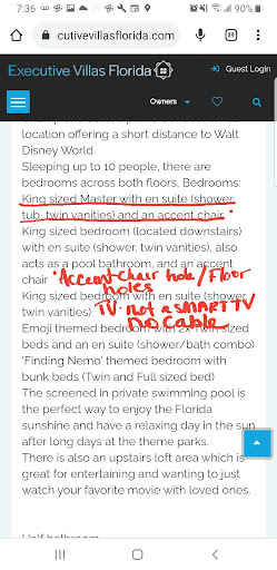 I stayed at this house for 8 days last week (7/24/21-8/1/21) w/ 3 adults and 3 kids. 3 adults had their own master bdrm which was great until....keep reading! 2 kids stayed in the Nemo theme room and 1 child stayed in the LOL theme room... again please keep reading!! First let me start off by saying, upon my arrival the house wasn't thoroughly clean. Exec Villas sent me an email stating the previous guests left late and the house wouldn't be ready until after 5pm. Luckily I was still in route when I rec'd the email. We got to the house after 8pm. After an 8 hr drive, I was upset to see sugar ants on the counter that was supposedly clean. For those of you that don't know about sugar ants, they ONLY appear if crumbs, sugar, food particles are around. Don't forget this house was "cleaned". My family & I cleaned this house until after 1am. The dishwasher was filthy with black marks which I REFUSED to clean!!! This wasn't cleaned until my 7th day stay and even then it couldn't get cleaned thoroughly, that's how filthy it was. The young lady used almost 1/2 a bottle of Fabulosa. I sent emails to Executive Villas...no response until I had to physically go to their office on 2 separate occasions. In addition to the lack of cleaning, this home has damages! Hole in screen door by the pool where anyone can unlock & use the pool (fixed on my 4th day). One of the master bdrm doors has a hole at the bottom of the door. Per maintenance, the door needs to be replaced. Holes in the same master bdrm carpet and a hole in the accent chair. Holes in the wall which maintenance patched on my 4th day. FALSE ADVERTISEMENT: The description states "Each bedroom is furnished with a flat screen TV (only part of this statement is true) and access to complimentary WiFi" - this is NOT TRUE!!!!!! Only 1 TV in the house is a SMART TV (in the sitting area). 2 master bdm TVs have cable. All of the kids' rooms have TVs but no cable, no WiFi accessibility, and they're not SMART TVs. The other master bdrm has a 42" or 50" TV (sorry not good with actual sizes by site) that you CAN'T watch. This TV has NO CABLE, NOR is it a SMART TV so again NOT WiFi accessible. Picture you're out all day & you want to lay in a master bdrm watch a little TV and can't. The kids are in their rooms and can't watch TV because NONE of these TVs have cable NOR are they WiFi compatible as they were falsely advertised. Maintenance came on the 4th day to check out the TV. He said there's nothing he can do, it's up to the homeowner to add cable and/or put up SMART TVs. Day 7 a cable man came to check to see if there was something he could do. He said the same thing the maintenance man said. It's up to the homeowner. The description also states: "Outdoor Living Space: Flat screen TV" - AGAIN NOT TRUE!!!! THERE'S NO TV OUTSIDE WHATSOEVER. My question, WHY FALSE ADVERTISE??? After complaining & complaining.. and STILL complaining even after coming back from my vacation. I was offered a refund of less than one night's stay plus a 10% discount for a future stay. That can't equate to the inconvenience we were caused for a 8 days stay at this property. This house was such a disappointment for me and my family. Executive Villas you have to do better than this as I've stated in ALL my emails attached with pictures. Champions Gate is a lovely place but your management team is HORRIBLE!! As you already know and front desk stated to me "this home should have NEVER been rented out with those damages I encountered"!! Managers do better...thoroughly INSPECT these homes before renting them out!!!! Executive Villas you are the face of the homeowners!! I requested a manager/supervisor to call me several times in ALL of my emails & NO RETURNED PHONE CALL!! Not even a courtesy call from ANDY!!