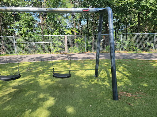 A running/ walking track circles an open field often used for soccer. There is an adult outdoor exercise area on the far side...
