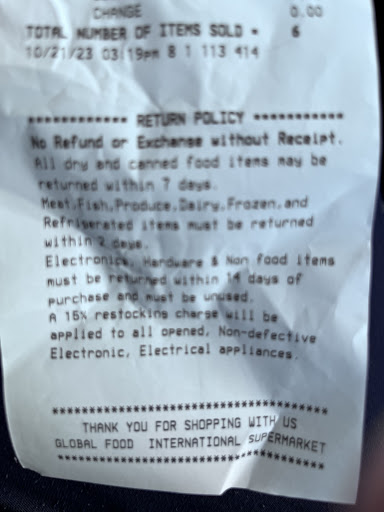Read moreHello! We had a Very Very Very nice experience today at Global Foods Security Location! The store was very clean and stocked up to perfection 👌 The workers in the produce section were on top of their jobs!!! Everything in the whole entire store was up to par! Very nicely done Global Food! You can best believe that my husband and I will be shopping there Very soon!!! Keep up the mighty fine work for your customers like me and others for more return visits. Oh...and the prices were outstanding! I spent $40.00...and got everything that I set out to get from a grocery store. Thank you so much for all of your hard work in pleasing customers like us! Sincerely, Monica & Morris = The Norris's 😄😃🥰💯👍👍👍👍👍👍👍💯💯💯👍👍👍👍 Not to forget the Seafood and Meats, and Halal Chicken Section too! Awesome Sauce 👌 👏 👍 😍 💖 🆒️...