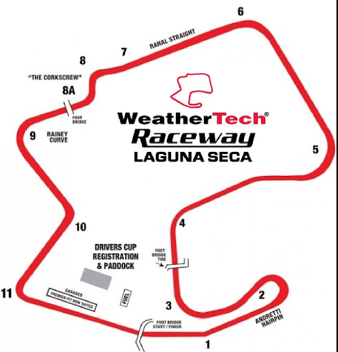 The natural terrain, elevation changes, the world famous corkscrew, we did 1:29 here with GT4RS Turn 1 the frontstraight has some kink, when doing 120, need to do it right; Turn 2 Andretti hairpin, double Apex with 180 degree. Breaking zone is downhill, breaking from 130, pretty dramatic; Turn 3 your mind tell you it is 90 degrees, it is actually tighter than 90 degrees so everyone tends to carry too much speed in then it is difficult to get fast out of it; Turn 4 righthander, the opposite of turn 3, less than 90 degrees can go scarily fast; Turn 5 lefthander, start to going up hill, a lot of camber, flat break zone. A lot of grip in the corner itself. Sound limit right after turn 5, therefore Laguna pipes 😝 Turn 6 a high pressure corner. You are so far uphill, the apex corner kinda fix down. You don’t see the apex when you make the turn, so you make a fast turn based on where you remember the track is; a car and half of really good camber down at the apex, no that camber beyond the apex. You have to get your car down the apex carry the proper speed, if too fast and you don’t get down there you will probably go off the track. Turn 7 kink to the corkscrew. Drive up hill more, big breaking zone, hill actually with a little crest you can break super hard into. Feel like driving off the cliff, slow corner 35 mph naturally slow down more than you need do coz your brain tell you it can’t see anything. Turn 8 Corkscrew; Turn 9 Rainey curve, complicated technical corner, super down hill. Track is kinda falling away from you the whole time. Everything of the car feels nervous and unsettling when it wants to gain speed on its own etc Turn 10 the opposite, still going down a little, so bank in camber, you can totally mess up the entry to 10 and then the turn can sneak you Turn 11 pretty...