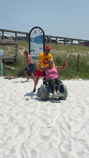 Did you know there’s an easier way for wheelchair bound individuals to gain access to the beach shoreline? Well I didn’t either. Courtesy of generous donations, there’s a wheelchair with GIGANTIC AIR-FILLED WHEELS to make navigating the sand much easier. This is a godsend for those wheelchair bound individuals and their families. The chair helps riding across the sand more effortless. You never knew you needed this until you did. Thank you Mr. Dylan we appreciate you!!!!