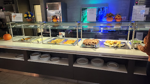 this is a buffet. lots to choose from, ranging from typical American dishes, to Asian, as well as salad bar, ice cream, and deli bar. honestly I've heard mixed reviews on the food, but it seems like the students enjoy it overall. this place is open to the public, but not always. it can easily get crowded, and sometimes the music is very loud. however there is lots of seating. the staff does what they can, but it definitely needs help at times with cleanliness. but I think its getting better. it is very expensive here, so you better come with a large appetite. it is a buffet so there's usually plenty to choose from. they do not allow carry-out. but they do offer grub-hub on certain items so you can have it made and skip the waiting..somewhat. (grubhub is available for omelets at breakfast, and sometimes...