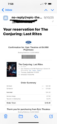 Read moreTerrible experience! I bought tickets online for The Conjuring, very excited to see it. Showtime was 7:55, we arrived at 7:20 and were checked in and told theater 4, we then spent $60 on popcorn etc. then went into the theater and there was already a movie playing, we thought maybe we are early and this is the end of whatever is playing, multiple employees saw us confused and waiting and just let us sit there in the lobby, at 7:45 I approached the concession stand to ask and they just kept saying theater 4, an assistant manager then stepped in and long story short they sold us tickets for a time the movie was not playing, it was in theater 4 but started at 7:10! Megan the assistant manager offered us a refund OR free passes, really? The refund should have been a given and the passes for the inconvenience not to mention the $60 in concession refunded as that all got tossed, AND they did not refund the service fee!!! Then she says itâs the last night this movie is playing, itâs only been in theaters for 2 weeks!!!!! Megan didnât seem to care about making it right. Shame on you Old Mill Playhouse, especially the way it was handled, they just didnât care, we wonât visit here ever, ever,...