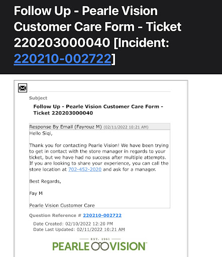 She had me speak with Ernest, who was nothing short of a gentleman and more than willing to address my concerns. I explained to him what had been going on as he patiently listened. I then asked him if there was any possible way to have my new prescription made and using an older set of eyeglass frames which I absolutely loved. (This was something that I had asked another associate my first visit after receiving an eye exam and picking out my frames, who said was NOT possible at all. Which is why I had settled for the super-tight frames)