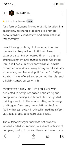 Inauthentic Reviews & Questionable Ethics My experience with Restore Hyper Wellness was disappointing on multiple levels, especially at the Dr. Phillips location. A major concern is that the reviews you see online may not be genuine. Restore openly incentivizes customers to leave positive reviews in exchange for free services like IVs — there’s even signage at the front desk promoting this. That means many reviews are not honest reflections of the service, but rather bought opinions. Worse, Restore appears to be deleting reviews that reflect negatively on them. I personally left a truthful review detailing my experience, only to find it removed without notice. This kind of review manipulation is unethical and misleading to potential clients who are trying to make informed decisions. Transparency and integrity should be core values in a wellness business. Sadly, that doesn’t seem to be the case here.