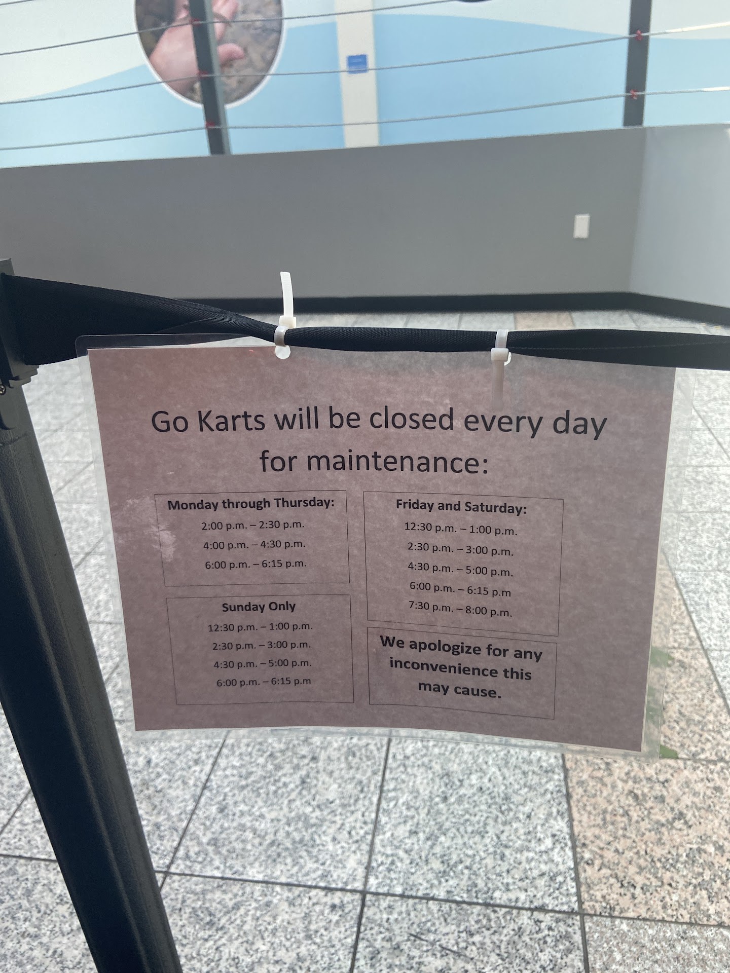 We stood in line for almost 40 minutes just for the staff to tell us, we have to take a break for the carts to charge, which is understandable but other than a dinky sign sitting at the front entrance, that wasn't noticed until after we left to get out of line, there was no reminder until it was almost our turn and they told us they're taking a break. We got out of line because the boys only had an hour left before they closed and wanted to wall climb.