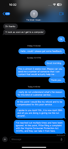 The worst customer service I have ever experienced. Booked a room and did not receive any form of confirmation etc . Called to confirm if it’s for the right place etc, I ran late by 5 minutes so I called to let the place know . She said that it was fine . When I arrived , the doors were locked . So my partner and I went up and down checking if we just at the wrong door if there was another entrance on the floor below and there was nothing at this point I called the number where they told me that there was a family emergency and someone had to leave so I said okay , the lady said that she needs to call someone and hung up . She then called me and told me someone will be coming and couldn’t provide an ETA where I was okay I’d like to cancel ( I had dinner reservations that would now clash seeing that I’m also not provided an eta) where I was told “you were late by 20 minutes you can wait a little longer , mind you it was only 5 minutes and I spent the rest of the time trying to figure out where’s the entrance seeing the doors were closed . I left and called about a refund no response , i had an international trip so I couldn’t call anymore so my partner called and she said that she would be refunding me . I have been in contact with the number , which was the lady that was on the phone with me and she has provided me no help . After telling me she will do the refund she asks me to give her information on my booking , I have provided this information and still no feedbacks or updates . She did explain to me that she had some stuff to take care of which I was really fine with and gave her some time but still no response . She continues to ignore me and at this point it’s been 7 days since her last response to me and I still have not received a refund or even just an update . I have exhausted myself with trying to speak to someone from there and will proceed to file a complaint with the VCPA.