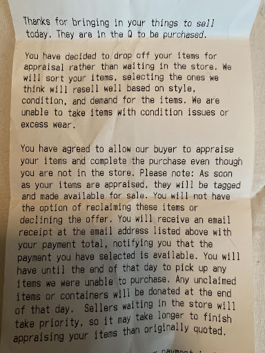 Read moreLong wait they make you wait in store if you’re dropping off clothes it’s extremely overwhelming and packed in there , I rather go to Plato’s it’s the same prices , they literally gave me $3 a piece for vintage items it’s a shame , but oh well I learned not to come back I don’t like their system , they were taking so much old looking Ross/2015 style and didn’t even take my brand new miss me jeans there were no imperfections yet they passed… and even the lululemon. Get some young people who specialize in Y2k I saw them take in lots of old looking items which are so out of style. I specialize in styling people and those clothes aren’t it… look into Y2k asap. 2 . READ BEFORE YOU GO New edit for their response , it’s not just an option when you don’t advertise the truth. It’s in the website but not the part I’m about to say. They mention you waiting in store or they’ll dontate your clothes you don’t want. But if you leave you’re forced to let them give you a price and you have to accept it and anything they don’t want they will “donate” you can’t take it back. You’re signing a contract that forces you. I did not know that before DRIVING all the way 30 minutes to them. I waited inside the store for almost two hours. It was the worse experience in my life. Go to Plato closet guys. If you leave it here you can’t say no to their price and you can’t take your clothes back. With Plato’s you can drop off and go on about your day. Imagine waiting almost two hours in a small store. They do that so people are forced to look cause you’ll be so damn bored you’ll buy stuff. Very weird tactic I don’t enjoy reselling here. It’s not an “option” when you don’t know this crazy policy before arriving and wasting gas.