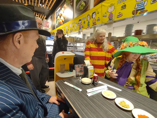 1st time to a sushi place. We loved the little robot that delivered the drinks. It took a minute to figure out but it was very fun and so many kinds of sushi to try and some more basic types for those who like meat instead of fish/seafood. But also a lot of different seafood things to try for the more discriminating pallets/braver tasters. We went after a Harry Potter event, so don't mind our strange outfits please.