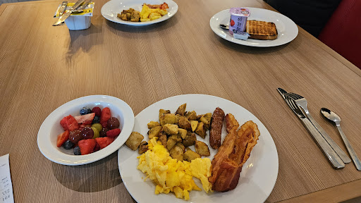 Got up and went down to breakfast, which was $15 for a "buffet " But sat and looked at the cook and the "server" for a few mins, got nothing in response. Then they both disappeared for a few minutes, then finally got someone to help us.... the buffet had soggy home fries, the eggs weren't very warm and bacon was over cooked and kept breaking trying to pick it up... there was fruit, yogurt and breads.... You can get more for a free breakfast at home2suites.... The pool was extremely small, it was pretty warm outside for the Saturday night we went... there was a fireplace out side. That was off and no chairs to use... Overall nice new hotel... but for the price and size... I...