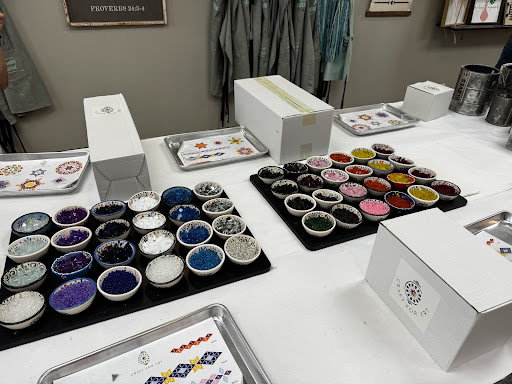 I like the experience was a 10. It was good trying something different. Charo making the mosaic candle an easy process. First apply the glass on the template design and then transfer it to the candle holder....