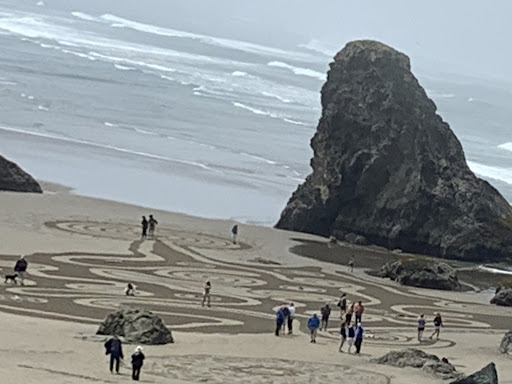 Face Rock Beach in BANDON OREGON is where you will discover CIRCLES IN THE SAND LABYRINTH CREATIONS. I was pleasantly surprised when I visited Face Rock Beach on Sunday June 26,2021. I love the rock formations on this beach. So needless to say when I approached the parking lot it was extremely full. I thought this was due to the excessive heat wave that had spread inland so everyone had the same idea to escape and visit the beach. As I looked from above there was a large labyrinth carved in the sand. It was breathtaking and beautiful. The lines were so precise from my viewpoint. As I walked down the beach access stairway I realized that there were quite a few visitors actually walking the labyrinth. I spent about 45 minutes walking in it. The detail was amazing. I could overhear the chatter from all around as people spoke in awe of the spiritual journey of this creation in the sand. When I returned home I posted the pictures on Facebook and a friend sent me a link to the webpage called CIRCLES IN THE SAND. It actually started in 2015. The artist is Denny Pyke and he has a team of volunteers that assist him in creating the DREAMFIELD. The low tides determine what time Denny & his team start to create the labyrinth and as the high tide comes in it disappears. Washed away but do not fret as the next morning Denny Pyke and his team will be creating a new labyrinth of the day. Starting April 30, 2021 through August 25, 2021 you too can enjoy this awesome creation. Please visit VENUESANDMENUSLEESIA.COM to enjoy...
