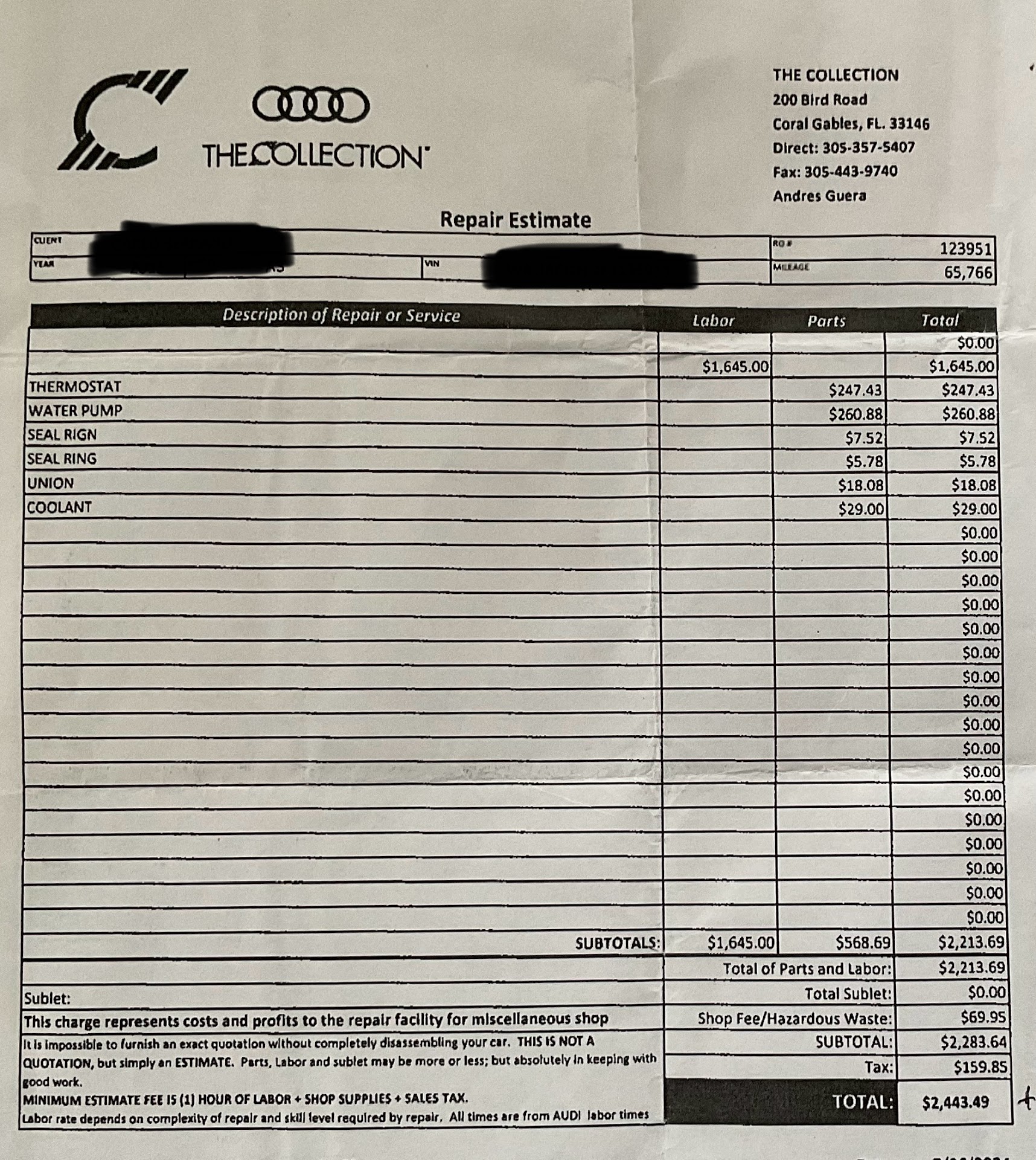 Let me start by saying that my vehicle was not service at your place. I took it for the engine light on which was the same reason it was there the last time not too long ago then I learn that it was a water pump and a thermostat replacement which is a recall NHTSA #24V110 and after showing my service advisor Andres the information we obtain from Audi and online I still got a bill of almost $3000 including the service diagnosis which by the way my vehicle was there not too long ago for the same issue and never got fixed correctly, the engine light on, I asked him to escalate this to the service manager, and he was very reluctant, but I put some pressure and finally he talked to the service manager, and I got nowhere as well.